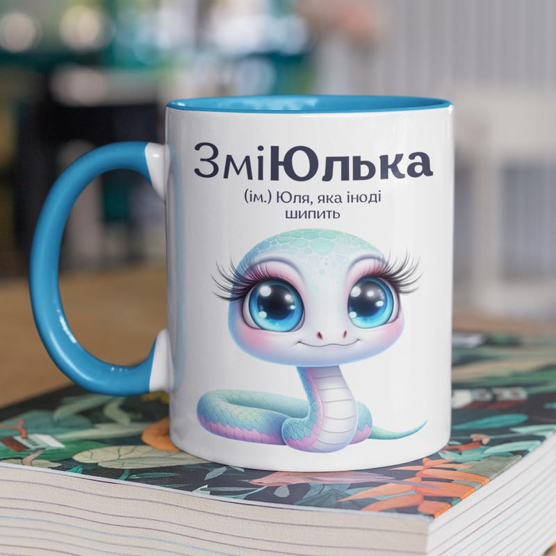 Чашка керамічна з принтом "зміюлька" 330 мл, біла з блакитною ручкою