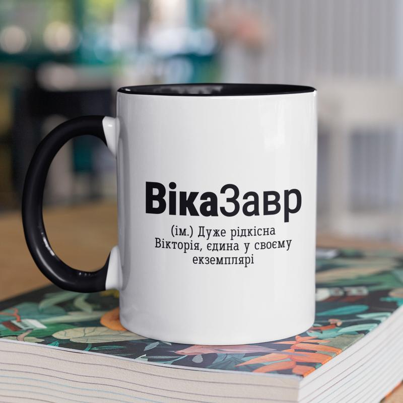 Чашка керамічна з принтом "віказавр" 330 мл, біла з чорною ручкою