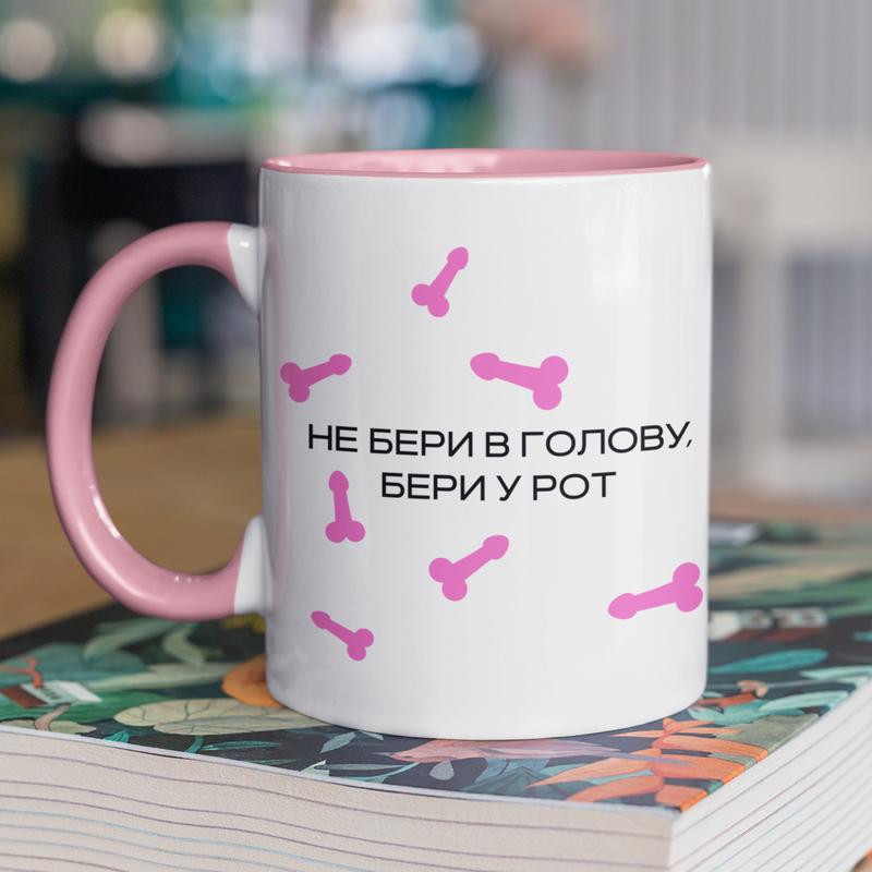 Чашка керамічна з принтом "не бери в голову" 330 мл, біла з рожевою ручкою