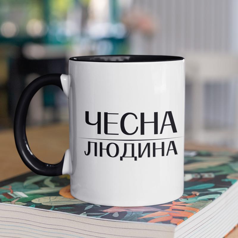 Чашка керамічна з принтом "чесна людина" 330 мл, біла з чорною ручкою
