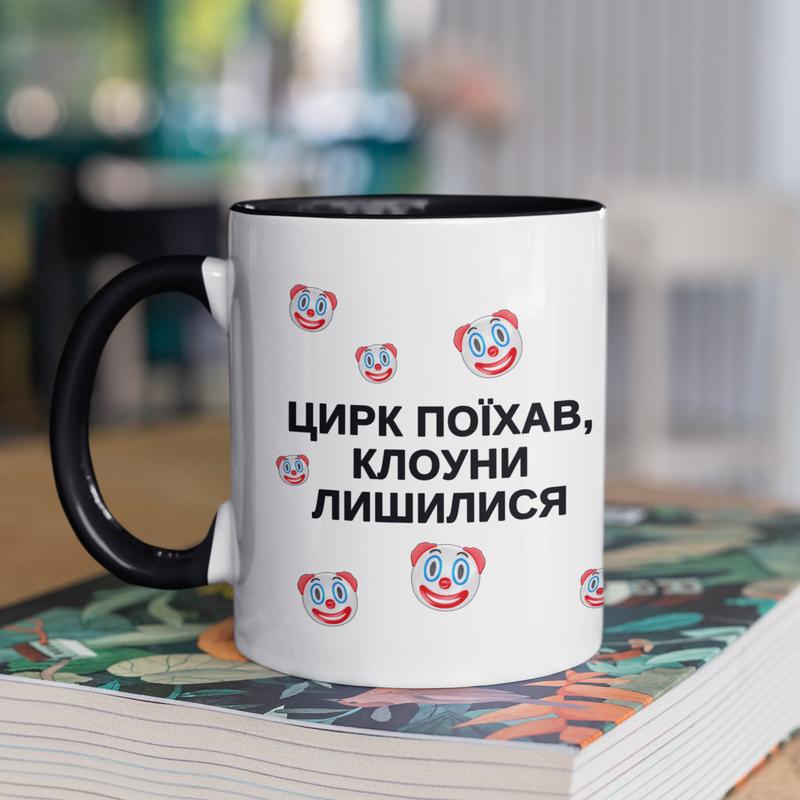 Чашка керамічна з принтом "цирк поїхав клоуни лишилися" 330 мл, біла з чорною ручкою |eas...