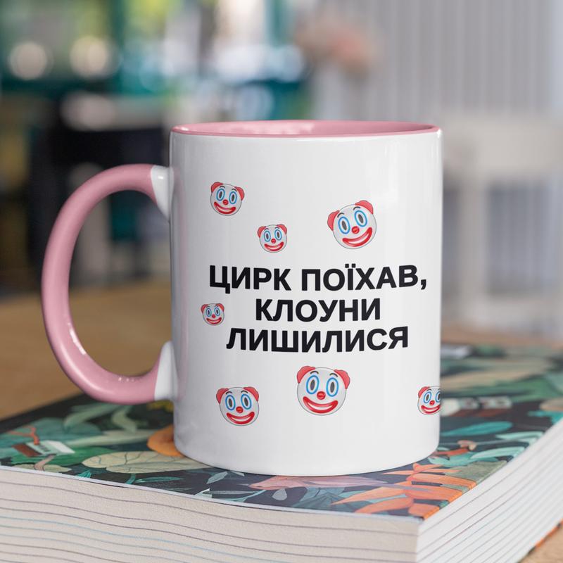 Чашка керамічна з принтом "цирк поїхав клоуни лишилися" 330 мл, біла з рожевою ручкою |ea...
