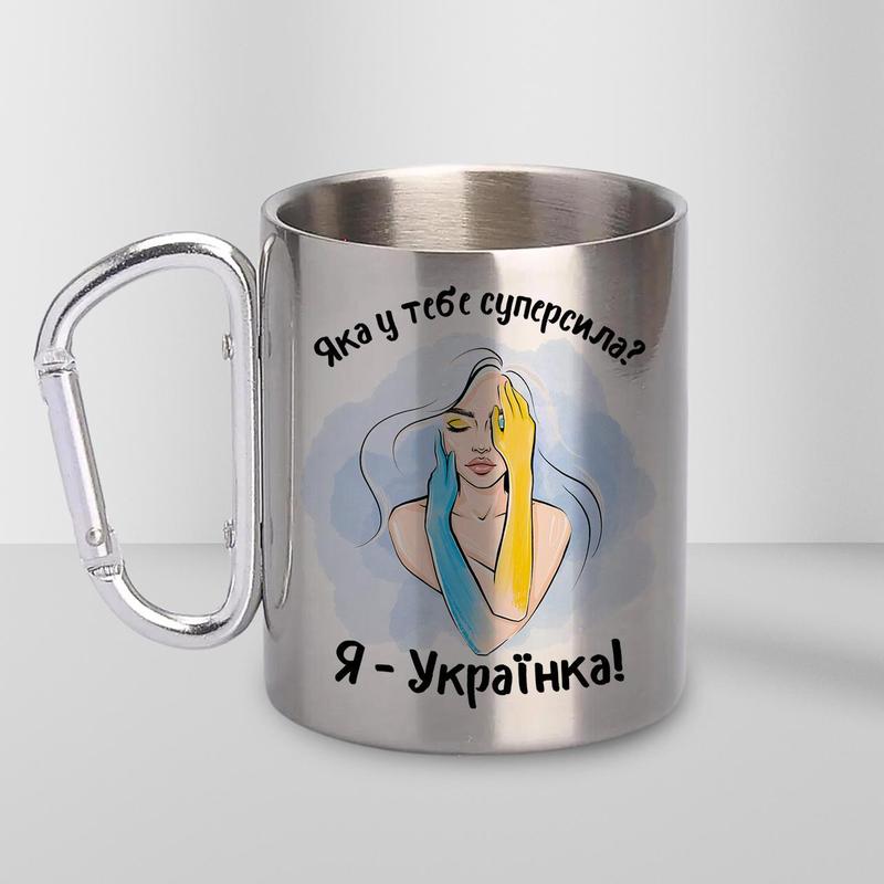 Кружка металева з карабіном "супер сила українка" 300 мл срібляста