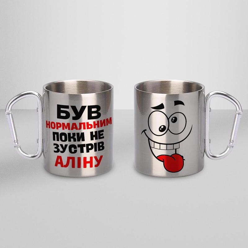 Кружка металева з карабіном "був нормальним поки не зустрів аліну" 300 мл срібляста