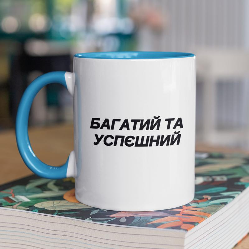 Чашка керамічна з принтом "багатий та успєшний" 330 мл, біла з блакитною ручкою