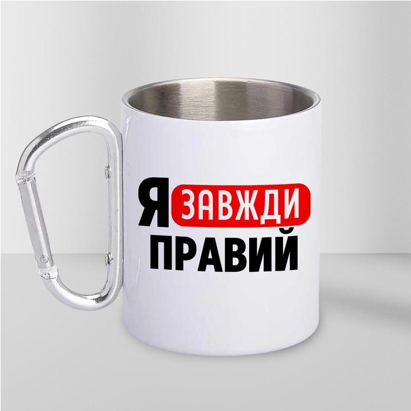 Чашка металева з принтом "я завжди правий" 300 мл з карабіном, біла