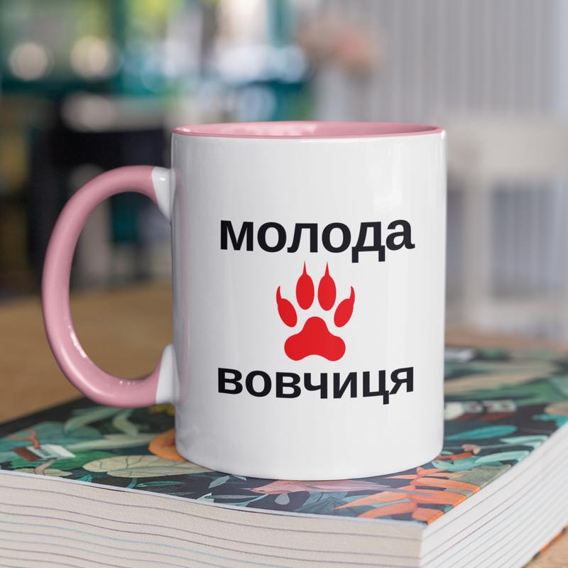 Чашка керамічна з принтом "молода вовчиця" 330 мл, біла з рожевою ручкою
