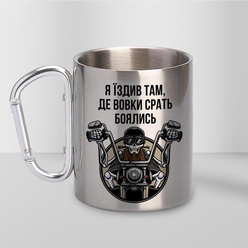 Чашка металева з принтом "я їздив там де вовки боялись" 300 мл з карабіном, срібляста