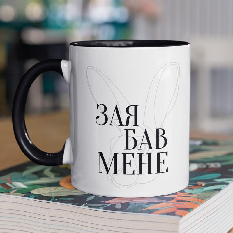 Чашка керамічна з принтом "зая бав мене" 330 мл, біла з чорною ручкою