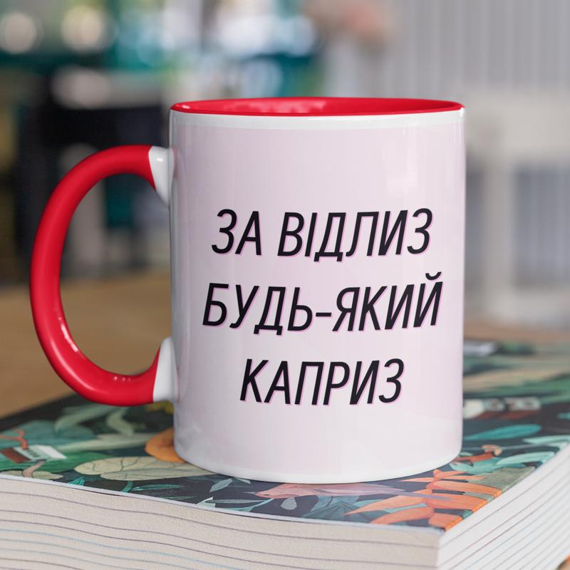 Чашка керамічна з принтом "за відлиз будь-який каприз" 330 мл, біла з червоною ручкою