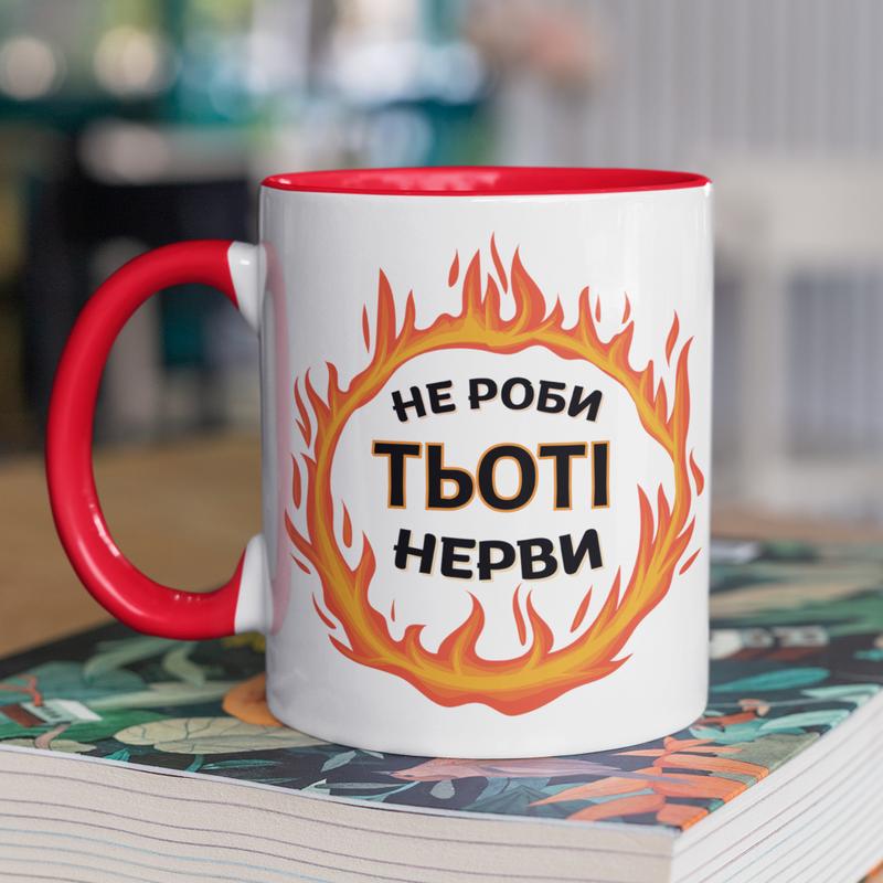 Чашка керамічна з принтом "не роби тьоті нерви" 330 мл, біла з червоною ручкою
