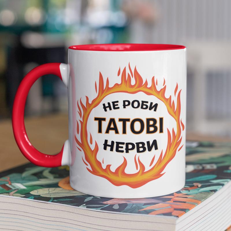 Чашка керамічна з принтом "не роби татові нерви" 330 мл, біла з червоною ручкою