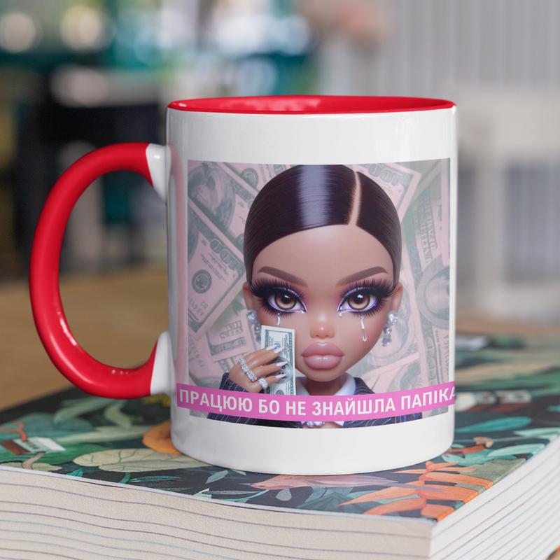 Чашка керамічна з принтом "працюю бо не знайшла папіка" 330 мл, біла з червоною ручкою
