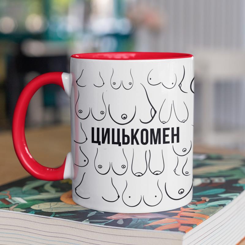 Чашка керамічна з принтом "цицькомен" 330 мл, біла з червоною ручкою