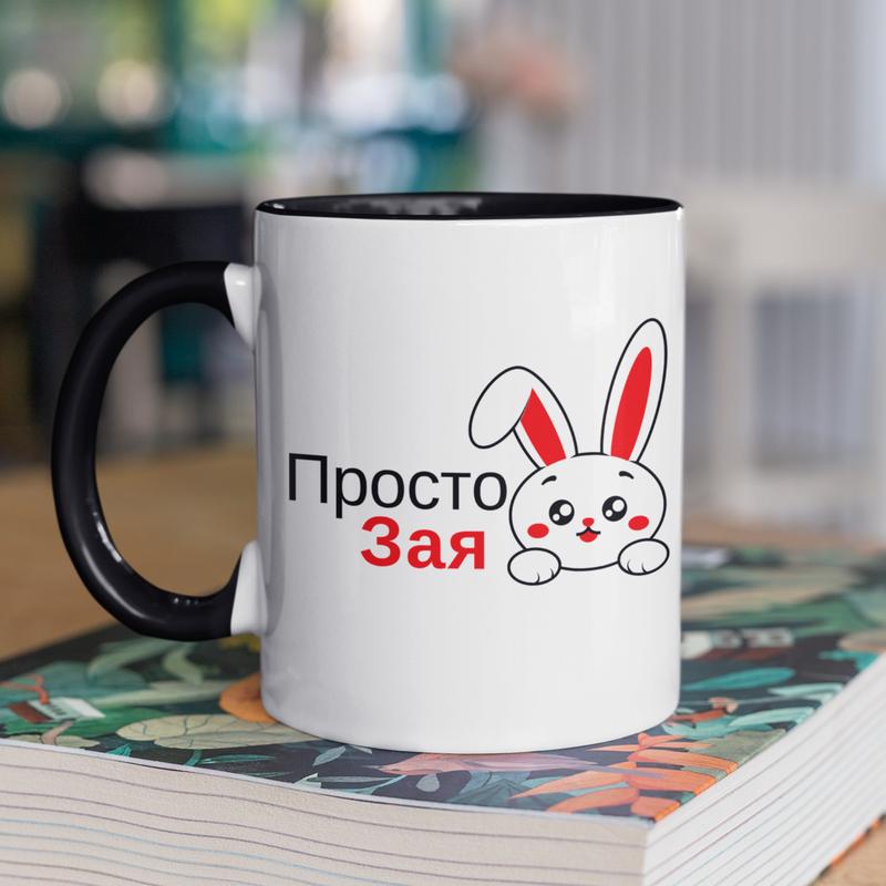 Чашка керамічна з принтом "просто зая" 330 мл, біла з чорною ручкою