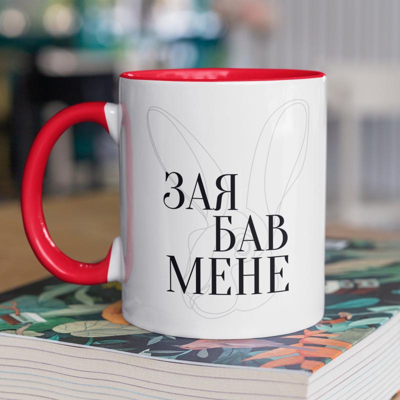 Чашка керамічна з принтом "зая бав мене" 330 мл, біла з червоною ручкою