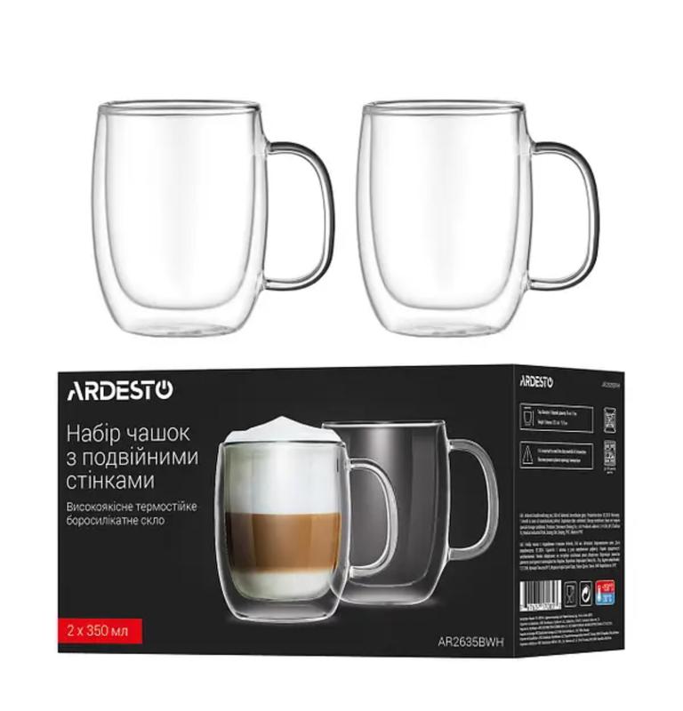 Набір чашок ardesto ar2635bwh з ручками і подвійними стінками 350 мл, 2 шт, прозоре бороси...