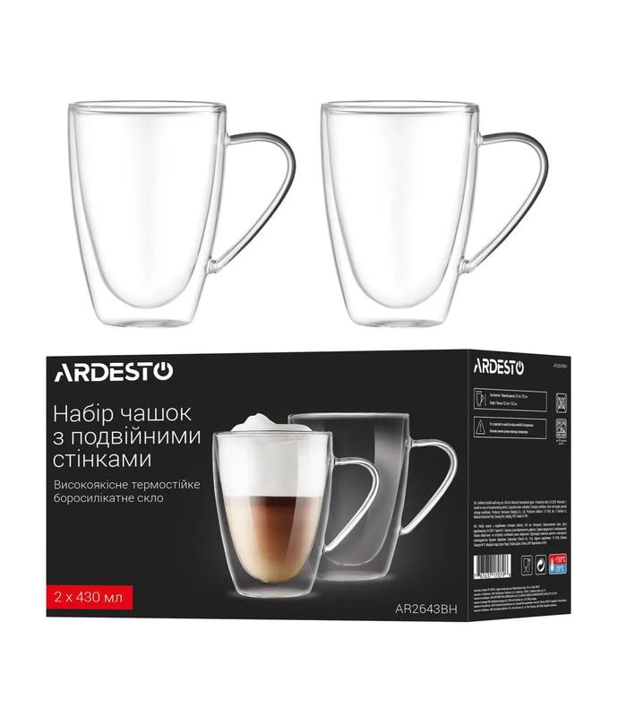 Набір скляних чашок ardesto ar2643bh 430 мл з ручками, подвійні стінки, 2 шт, прозорі
