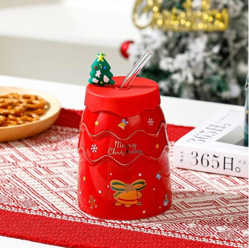 Новогодняя керамическая чашка со стеклянной трубочкой в комплекте (красный), 420 мл