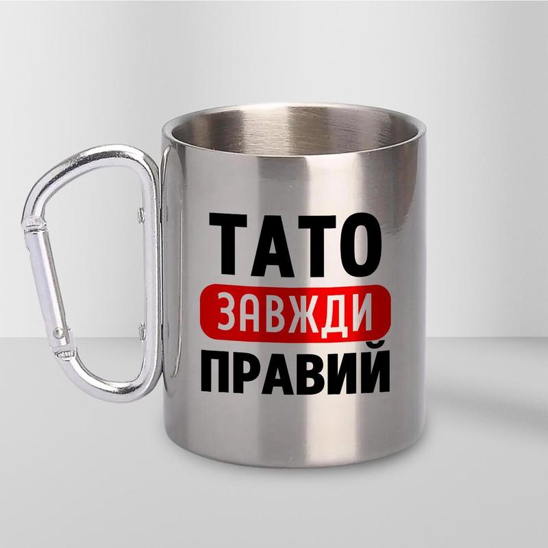 Чашка металева з принтом "тато завжди правий" 300 мл з карабіном, срібляста