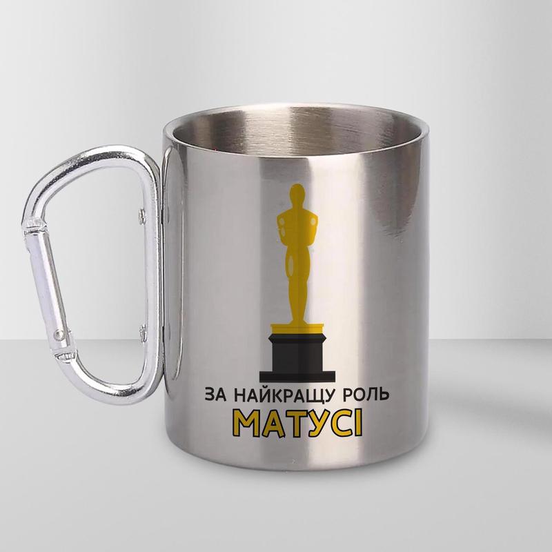Чашка металева з принтом "за найкращу роль матусі" 300 мл з карабіном, срібляста