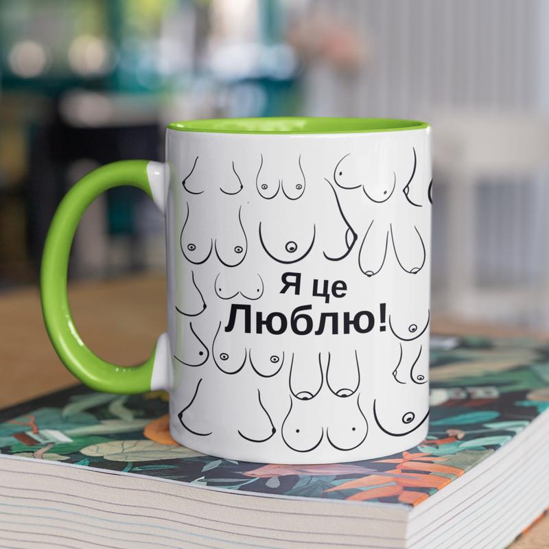 Чашка керамічна з принтом "я це люблю" 330 мл, біла з зеленою ручкою