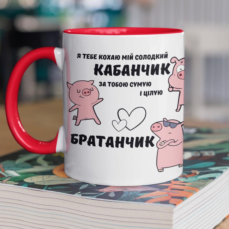 Чашка керамічна з принтом "мій кабанчик" 330 мл, біла з червоною ручкою