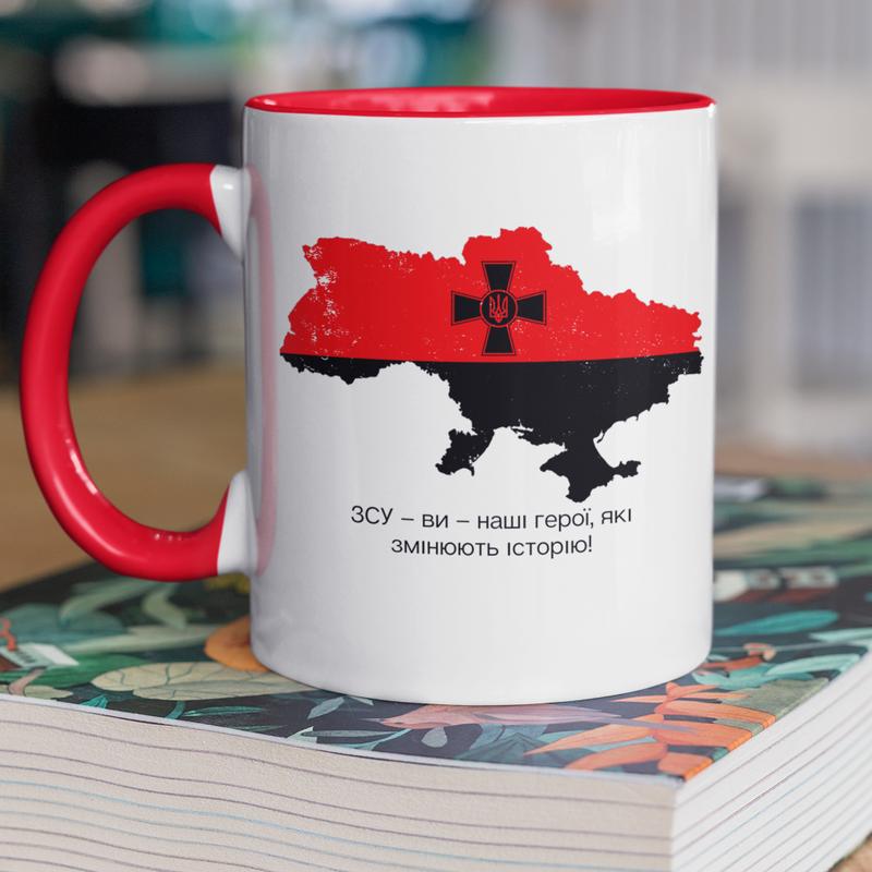 Чашка керамічна з принтом "зсу ви наші герої" 330 мл, біла з червоною ручкою