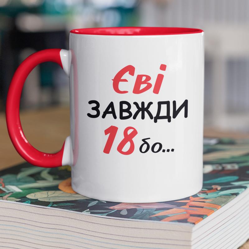 Чашка керамічна з принтом "єві завжди 18" 330 мл, біла з червоною ручкою