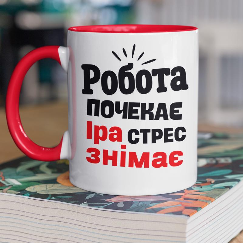 Чашка керамічна з принтом "іра стрес знімає" 330 мл, біла з червоною ручкою