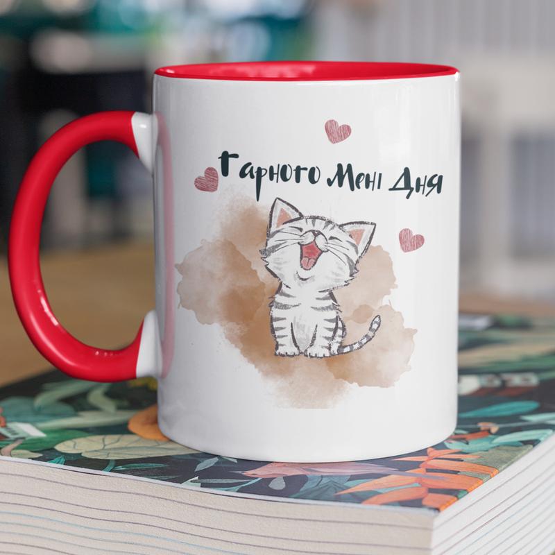 Чашка керамічна з принтом "гарного мені дня" 330 мл, біла з червоною ручкою