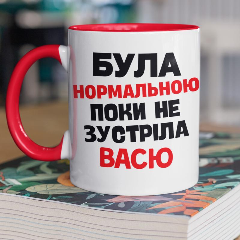 Чашка керамічна з принтом "була нормальною поки не зустріла васю" 330 мл, біла з червоною...