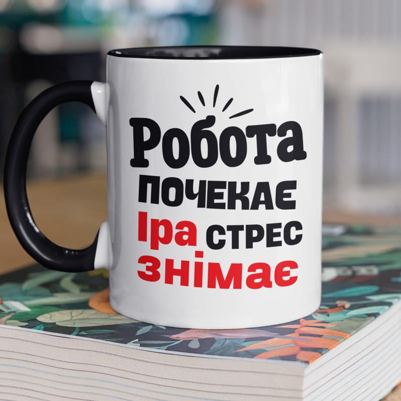Чашка керамічна з принтом "іра стрес знімає" 330 мл, біла з чорною ручкою