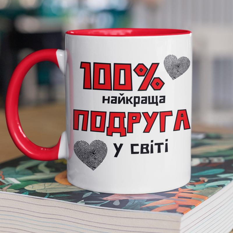 Чашка керамічна з принтом "100 найкраща подруга" 330 мл, біла з червоною ручкою