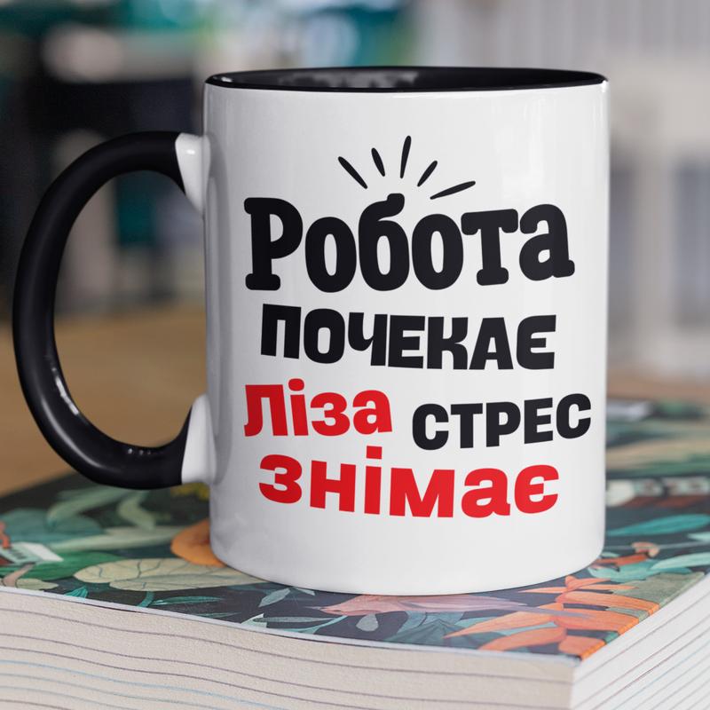 Чашка керамічна з принтом "ліза стрес знімає" 330 мл, біла з чорною ручкою