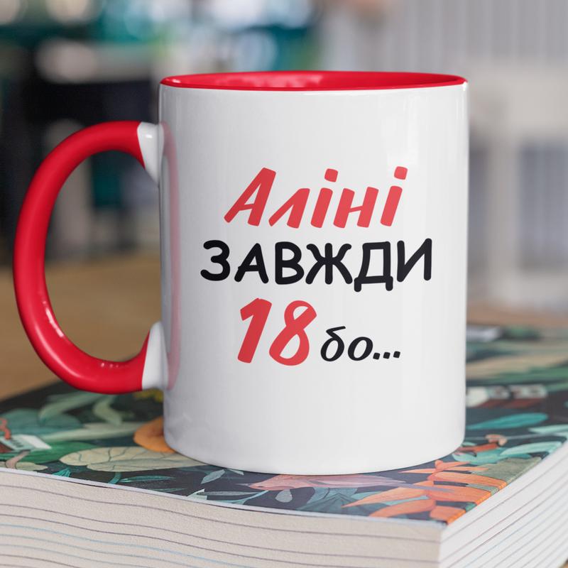 Чашка керамічна з принтом "аліні завжди 18" 330 мл, біла з червоною ручкою