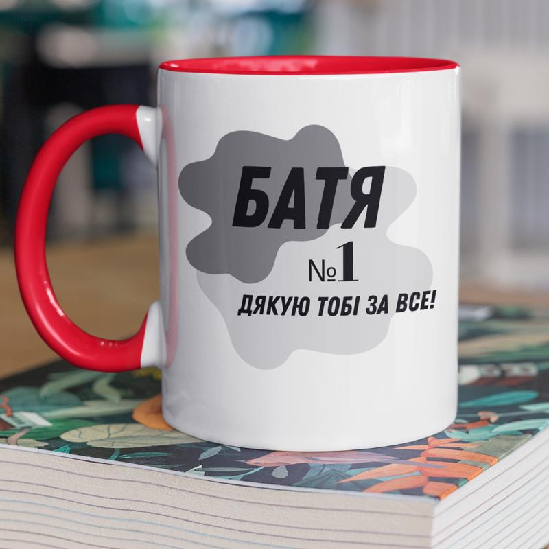 Чашка керамічна з принтом "батя №1 дякую тобі за все" 330 мл, біла з червоною ручкою