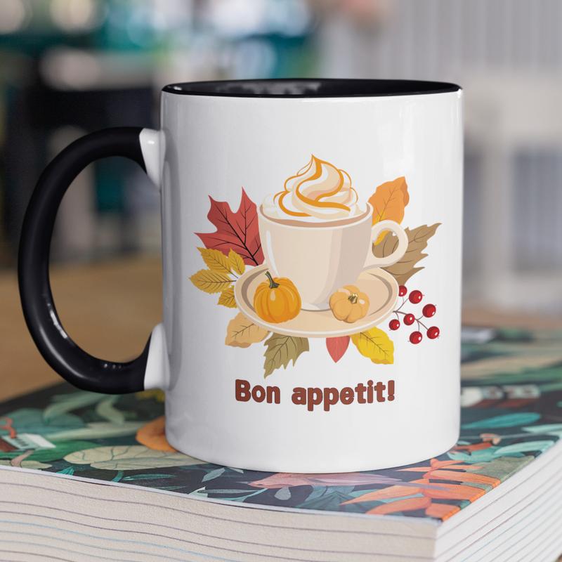 Чашка керамічна з принтом "bon appetit" 330 мл, біла з чорною ручкою