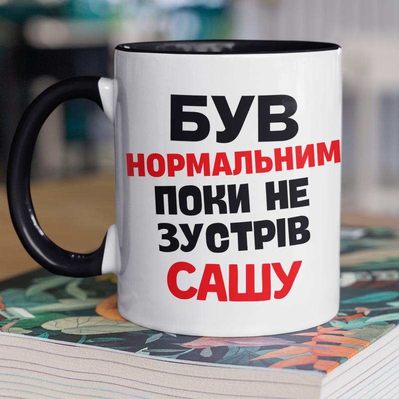 Чашка керамічна з принтом "був нормальним поки не зустрів сашу" 330 мл, біла з чорною ручк...