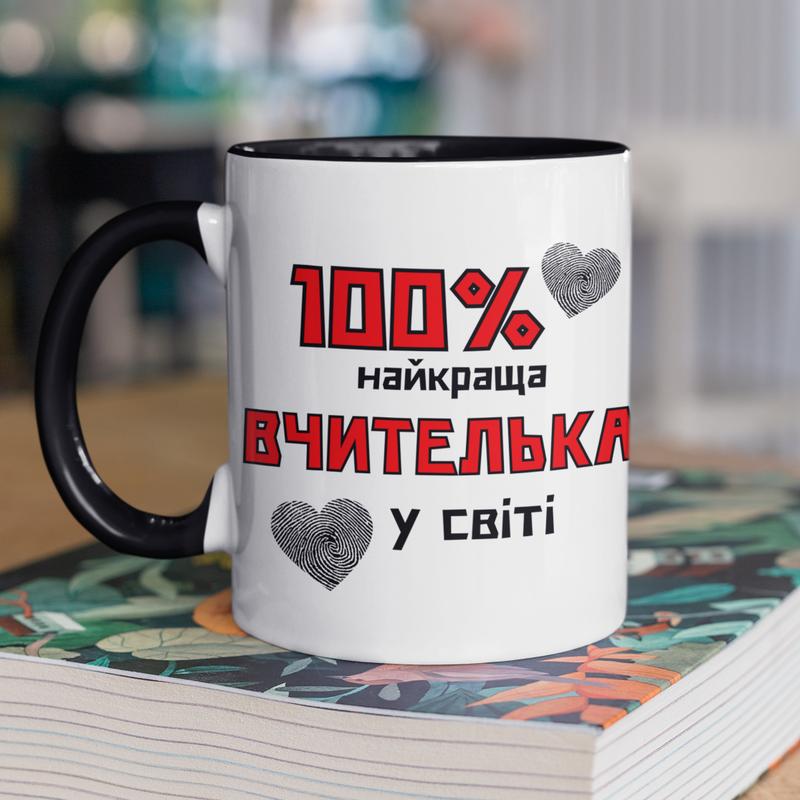 Чашка керамічна з принтом "100 % найкраща вчителька" 330 мл, біла з чорною ручкою