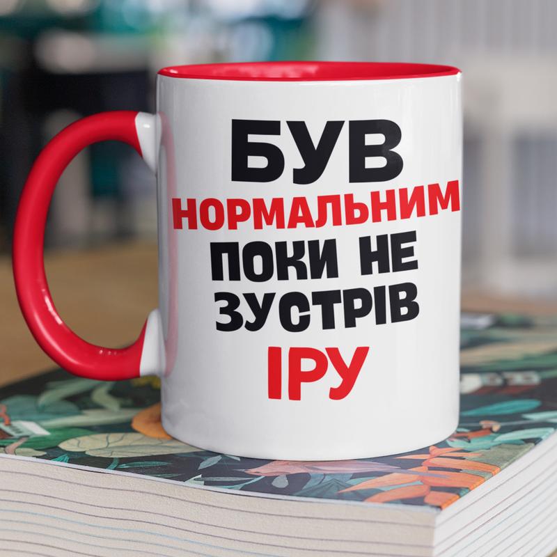 Чашка керамічна з принтом "був нормальним поки не зустрів іру" 330 мл, біла з червоною руч...
