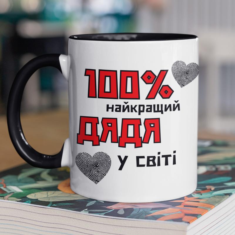 Чашка керамічна з принтом "100 % найкращий дядя" 330 мл, біла з чорною ручкою