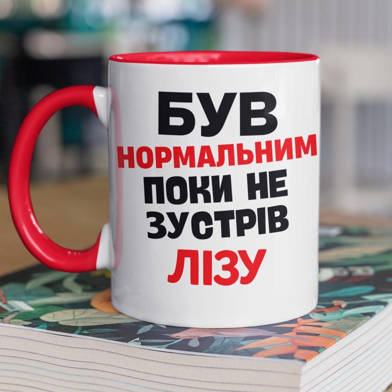Чашка керамічна з принтом "був нормальним поки не зустрів лізу" 330 мл, біла з червоною ру...