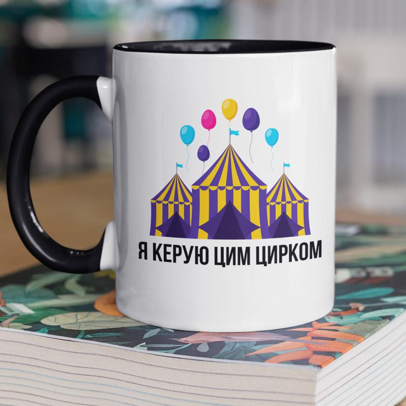 Чашка керамічна з принтом "я керую цим цирком" 330 мл, біла з чорною ручкою
