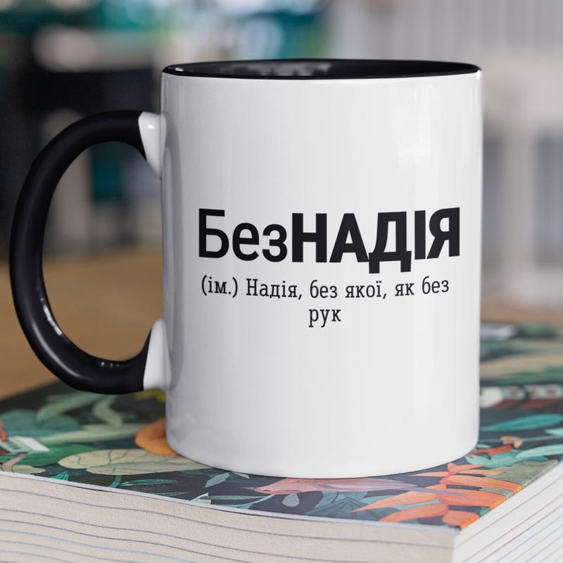 Чашка керамічна з принтом "безнадія" 330 мл, біла з чорною ручкою