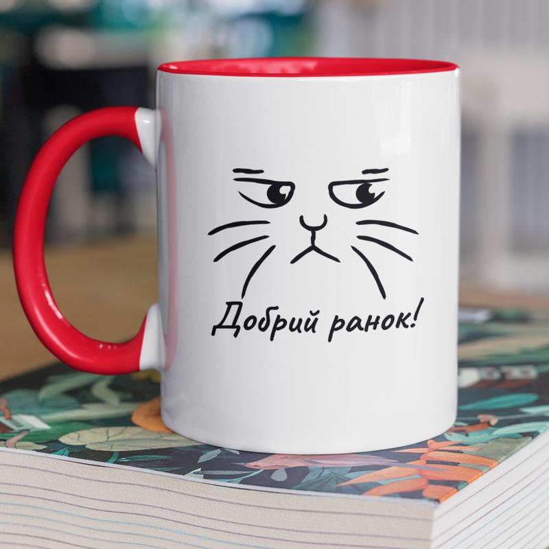 Чашка керамічна з принтом "добрий ранок" 330 мл, біла з червоною ручкою