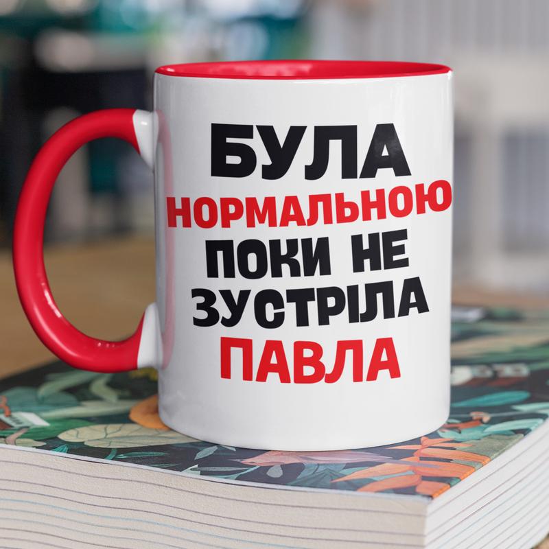 Чашка керамічна з принтом "була нормальною поки не зустріла павла" 330 мл, біла з червоною...