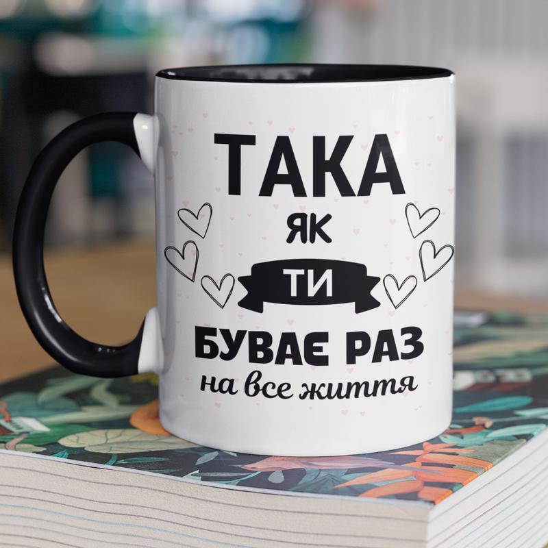 Чашка керамічна з принтом "така як ти буває раз на все життя подруга" 330 мл, біла з чорно...
