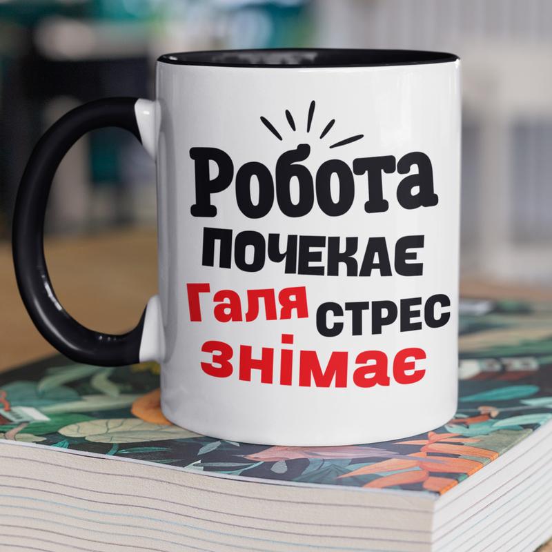 Чашка керамічна з принтом "галя стрес знімає" 330 мл, біла з чорною ручкою