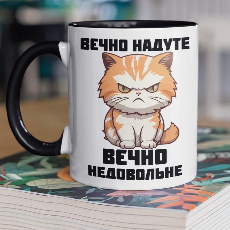 Чашка керамічна з принтом "вєчно недовольне" 330 мл, біла з чорною ручкою